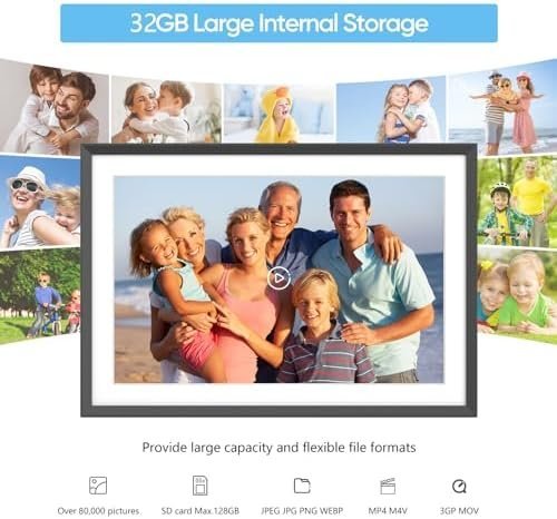 【Wifi Smart Picture Frame】: Connect the electronic picture frame to WiFi network , download the Free FRAMEO app on the phone. then you can privately and safely share photos or videos with family from anywhere and anytime. Built-in 32GB memory and allows to insert SD card(max. 128G, not included), enabling you to read files and export, and back up the received photos and videos for better album management.