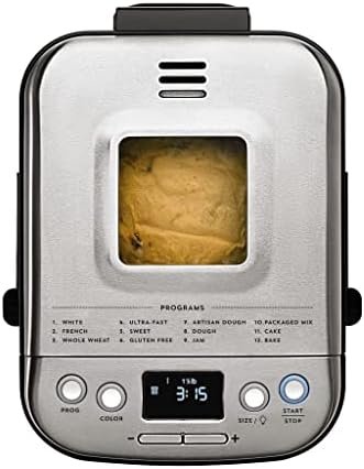 Everybody loves homemade bread, but not everybody has time to make it. Let Cuisinart do it for you! our versatile and compact automatic bread maker offers a variety of crust colors and loaf sizes, as well as 12 preprogrammed menu options. Foolproof recipes include everything from gluten-free and artisan breads to jams and sauces. With a convenient 13-hour delay-start timer, that wonderful aroma of just-baked bread can be waiting for you when you wake up. Features: Compact vertical bread maker with stainless steel exterior|12 preprogrammed menu options – fully automatic easy to use|3 crust shades – light medium or dark|Bakes up to a 2-pound loaf|Viewing window to monitor the process|Removable kneading paddle and bread pan|Interior light to check bread as it bakes|Easy-to-read LED display|Bake-Only option|13-hour delay start – fresh bread anytime!|Power failure backup|BPA-free|Limited 3-Year warranty.