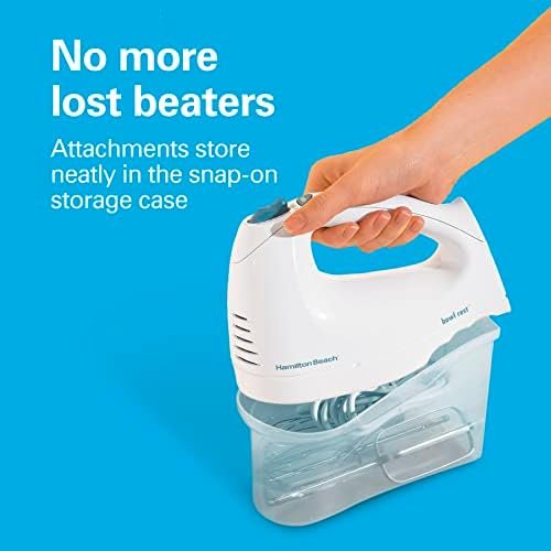 Whip up an airy meringue or decadent cake with the Hamilton Beach hand mixer. This versatile mixer is your go-to appliance for mixing, whisking, and folding with 250W of peak power. A built-in bowl rest makes it easier to set the mixer down when adding ingredients. The mixer has six speeds, including quick burst functions for additional power at any speed. The Hamilton Beach hand mixer is not just about performance, it’s also designed for easy storage. A convenient snap-on case keeps attachments together, so you don’t have to search for them each time you need them. Includes traditional beaters and whisk.Snap-On Storage Case No more digging through the drawers to find your mixer attachments. A storage case perfectly fits all the attachments and cord. It then snaps onto the mixer, keeping everything together in one place.Snap-On Storage Case: No more digging through the drawers to find your mixer attachments. A storage case perfectly fits all the attachments and cord. It then snaps onto the mixer, keeping everything together in one place.
