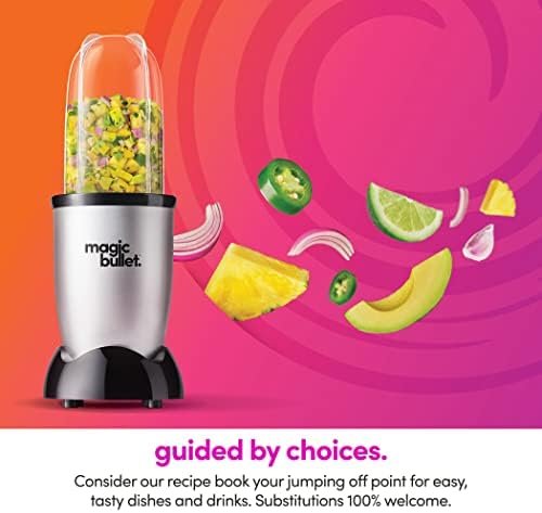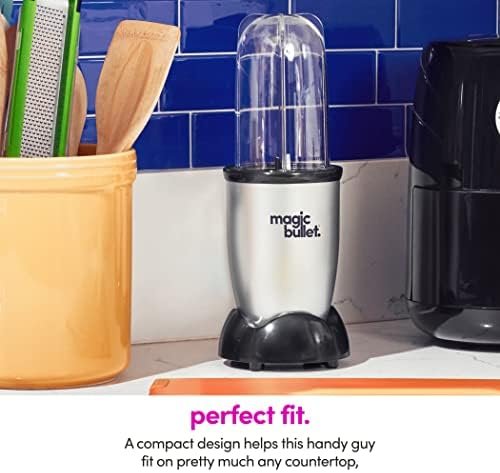 Magic Bullet 11-Piece Set Blender & Food Processor for Kitchen with Over 40 million Bullets sold! Make it fast by keeping it simple. Does any job in 10 seconds or Less! Hi-speed blender & mixer. 10 second recipe book included. Like your personal kitchen food processor & blender assistant. Do it all with hi-speed blender & mixer system. Chop, Mix, Blend, Whip, Grind, and Mince. Handy versatile and easy to use, the Magic Bullet Blender & Food Processor takes up minimal counter space while showcasing maximum speed and versatility. With its unique design and compact size, the Magic Bullet Blender & Food Processor chops, mixes, blends, whips, grinds and more in less time than it takes to assemble standard kitchen appliances. Make the perfect smoothies and milkshakes, frozen cocktails, and pureed soups super easily! And with a wide array of dishwasher-safe attachments, clean-up is as easy as it gets. The secret to the Magic Bullet’s time-saving efficiency is its specially designed blade and unique bullet shape. These features work together too quickly and forcefully circulate food back into the Cyclonic Cutting Zone, allowing the Magic Bullet to do virtually any food prep task in seconds.