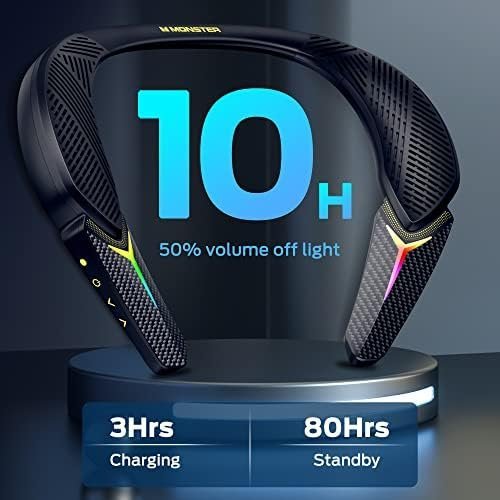 【Immersive Audio Experience】The Neckband Bluetooth speaker built-in 3W speaker system and 2 bass diaphragms, creating a truly unique and pure Monster sound experience.Experience a full-range speaker on both sides of the neck speaker surrounding your ears to produce 3D theater sound quality. Immerse yourself in the 3D private cinema.