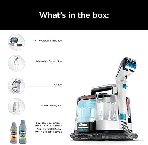 WHAT’S INCLUDED: Shark StainStriker, integrated crevice tool, 3.5″ reversible bristle tool, pet tool, hose clean tool, 6oz Deep Clean Pro Formula, 12oz OXY Multiplier Formula