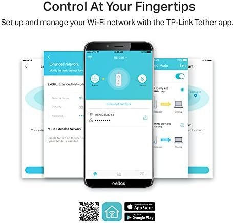 Boost Whole Home Wi-Fi with Your Existing Router A single router has limited Wi-Fi coverage and always causes Wi-Fi dead zones. RE550 wirelessly connects to your existing router and expands its Wi-Fi signal into areas it can’t reach on its own. Enjoy your stable network experience wherever you are at home. Faster Dual Band Wi-Fi up to 1900 Mbps RE550 delivers dual band (2.4 GHz and 5 GHz) to transmit Wi-Fi signals, doubling the performance of each band. It enables you to keep more devices connected at the same time with its 600 Mbps 2.4 GHz and 1300 Mbps 5 GHz dual bands. Use the 2.4 GHz band to send email and browse the web and the 5 GHz band for gaming and HD streaming. Wi-Fi keeps Strongest for Unlimited Moving With TP-Link OneMesh Technology, it’s easy to form a wifi network with a single Wi-Fi name for seamless whole home coverage. Just connect RE550 to a OneMesh router. Always enjoy the strongest Wi-Fi when you’re walking around with no need to search around for a stable connection. Adaptive Path Selection: Keeps Itself Working at Top Speed Adaptive Path Selection keeps your network running at optimal speeds by automatically choosing the fastest connection path to the router. Always keep your devices fast and stable—ideal for network environments crowded with many devices and applications. High Speed Mode: Maximized Speed with Dedicated Backhaul Uses one dedicated Wi-Fi band as backhaul and another dedicated Wi-Fi band as an access point to maximize the bandwidth on the extended Wi-Fi. Built-In Access Point Mode RE550 is more than a wireless range extender. Simply plug an Ethernet cable into its Ethernet port and easily turn your wired internet connection into a 3×3 MIMO dual band wireless access point. Control at Your Fingertips Set up and manage your Wi-Fi through the TP-Link Tether app from your smartphone (Android, iOS), including TP-Link routers and range extenders.